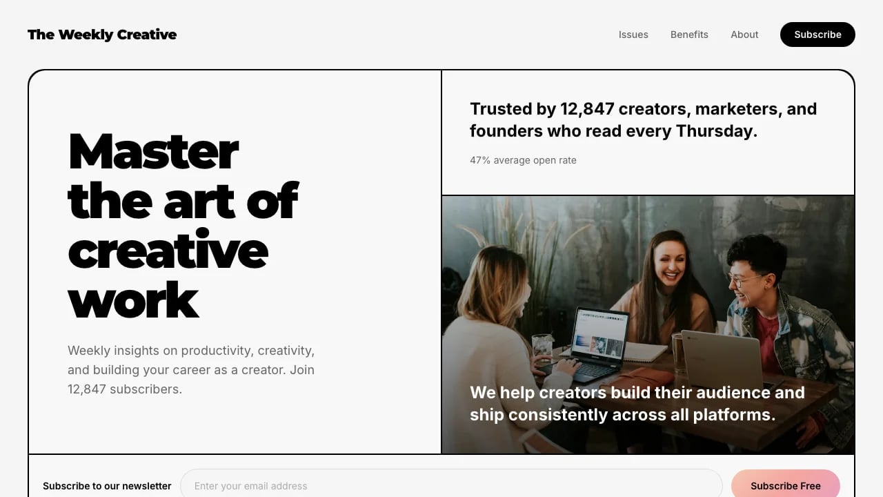 Lifestyle blogLaunch your independent newsletter without platform fees eating your revenue. Professional design, built-in signup forms, and one-click publishing—go live in hours, not weeks.Websites